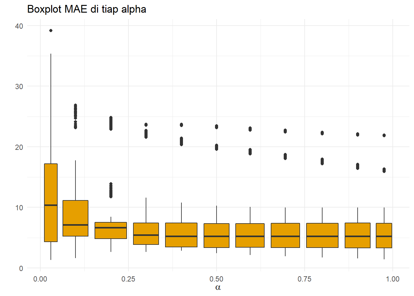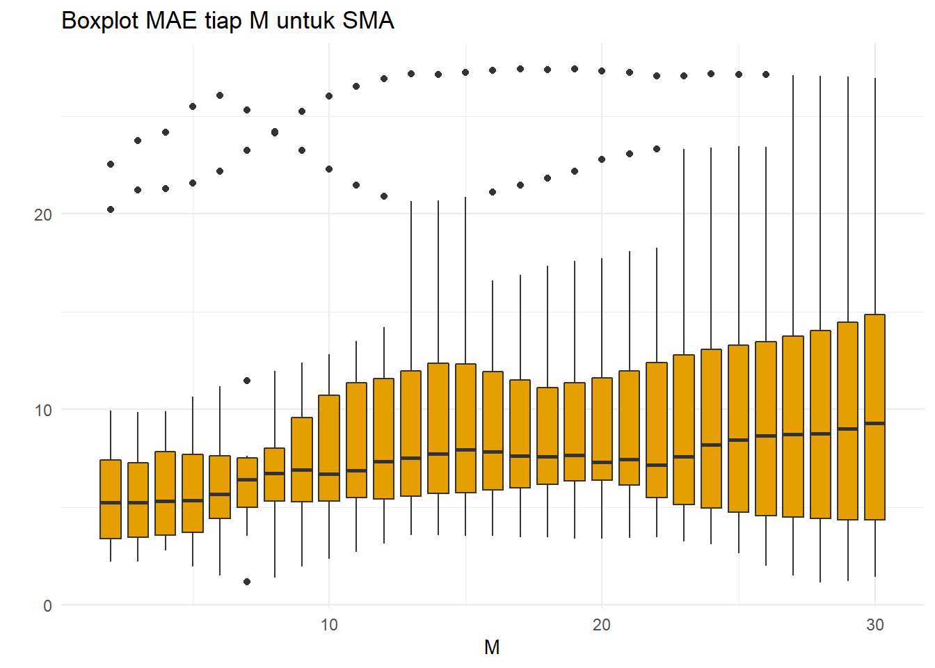 Hasil cukup mirip dengan MSE, tetapi ada sedikit perbedaan. Nilai pencilan pada boxplot MAPE cenderung meningkat seiring dengan bertambahnya nilai parameter M sampai \(M=10\), lalu stagnan. Bagaimana dengan MAE: