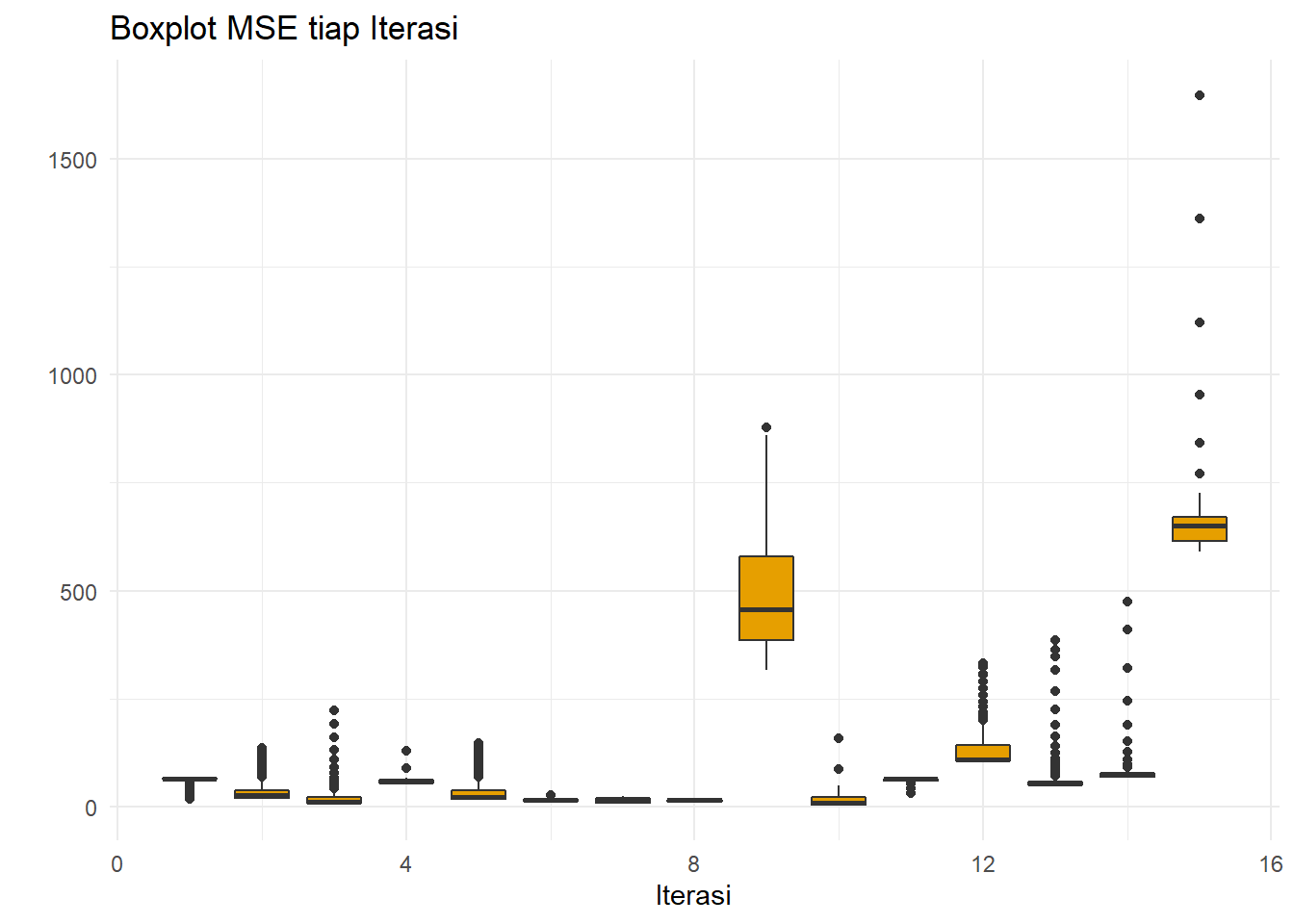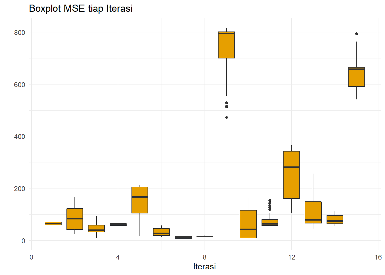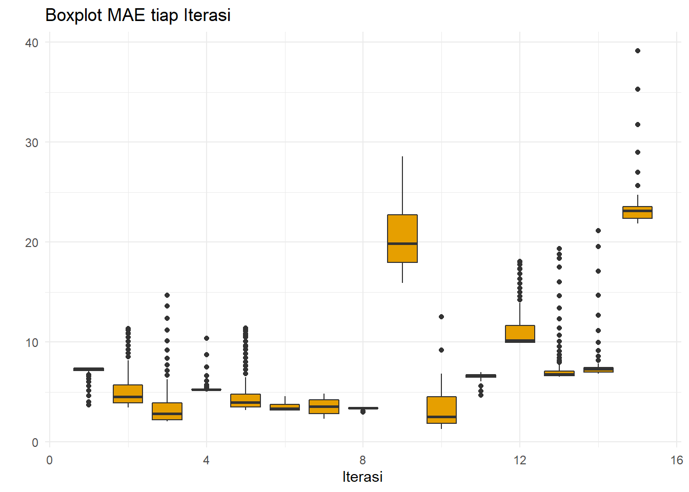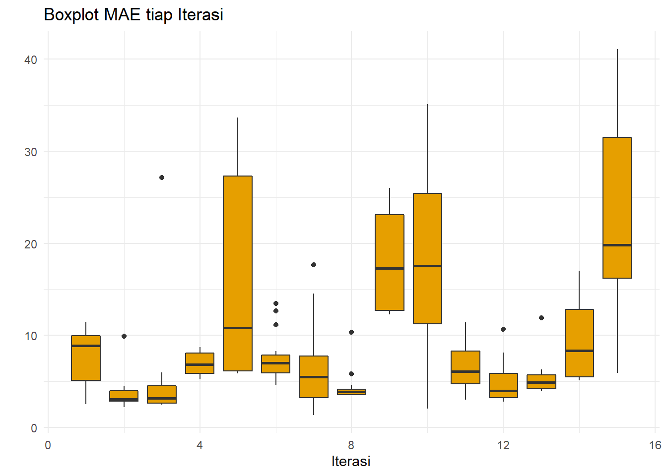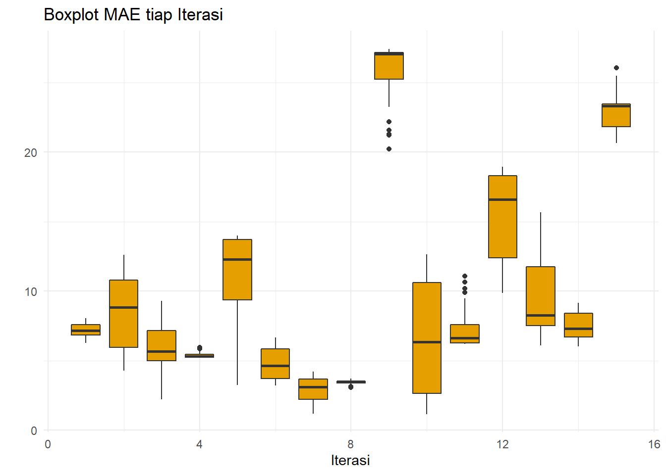 Boxplot MAE per iterasi mengikuti boxplot MSE - terjadi performa buruk di iterasi ke-9 dan 15.