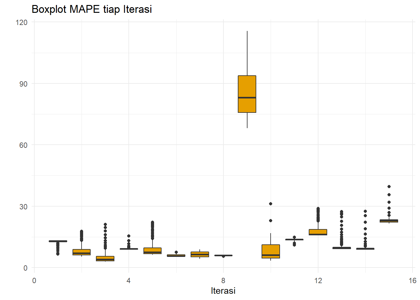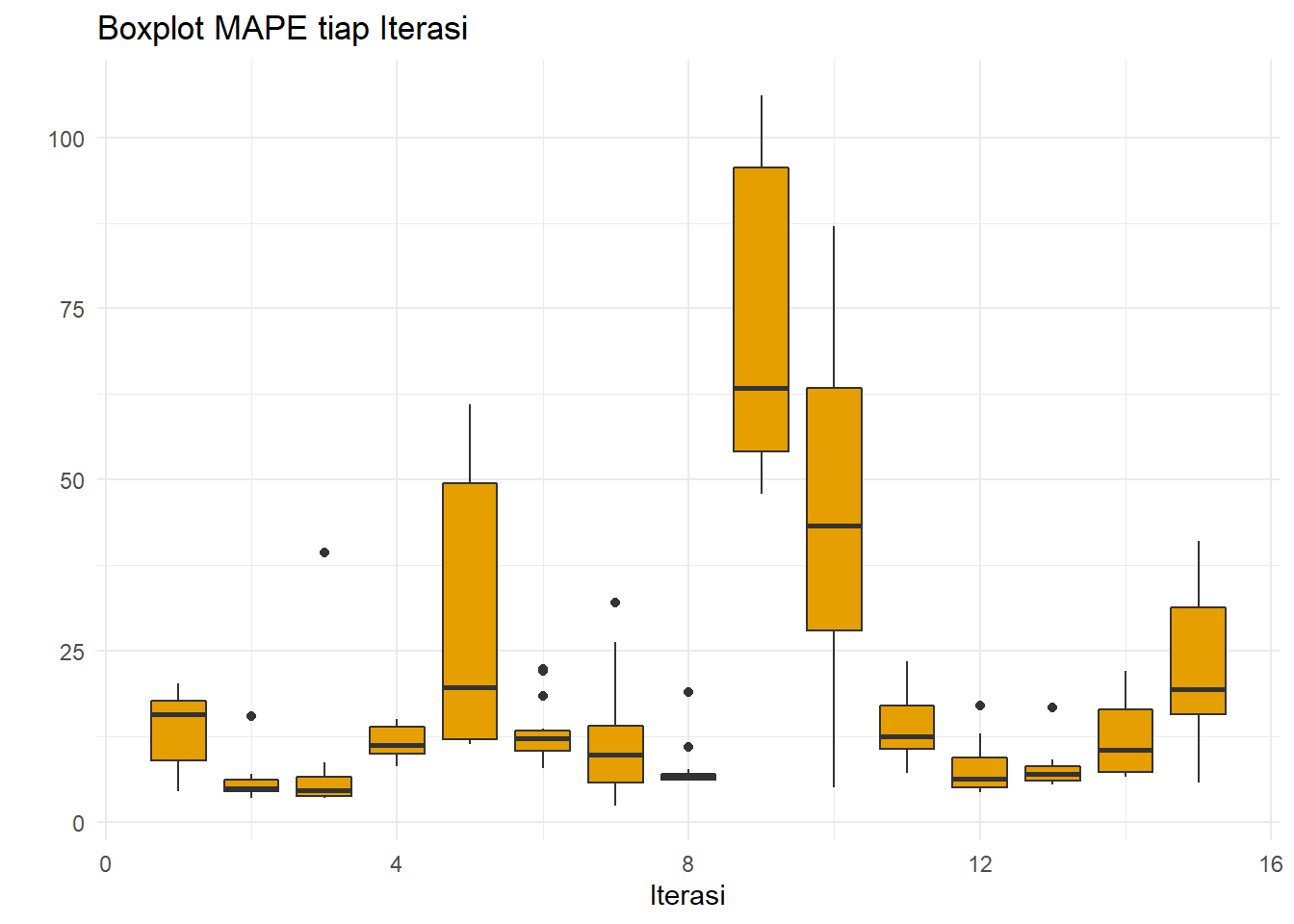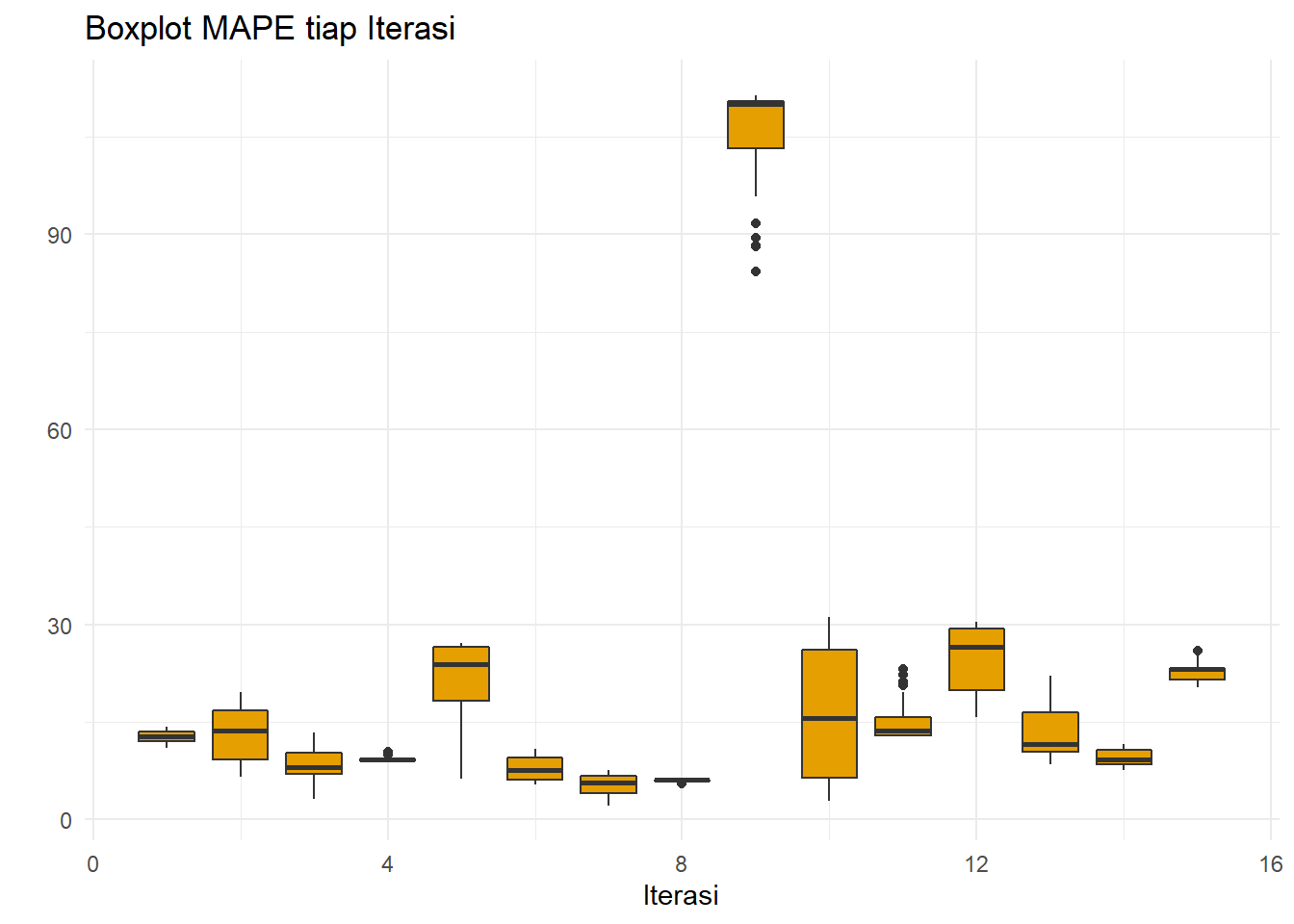 Boxplot untuk iterasi ke-15 ternyata tidak memiliki MAPE besar. Ini terjadi karena MAPE lebih memboboti observasi dengan nilai amatan kecil (COVID saat harga minyak turun) daripada saat nilai amatan besar (Ukraina-Rusia saat terjadi inflasi harga minyak).