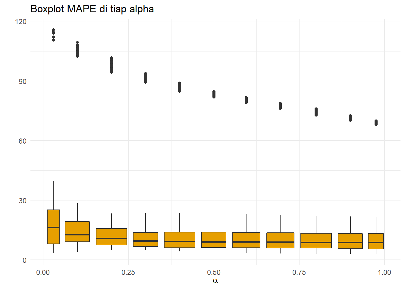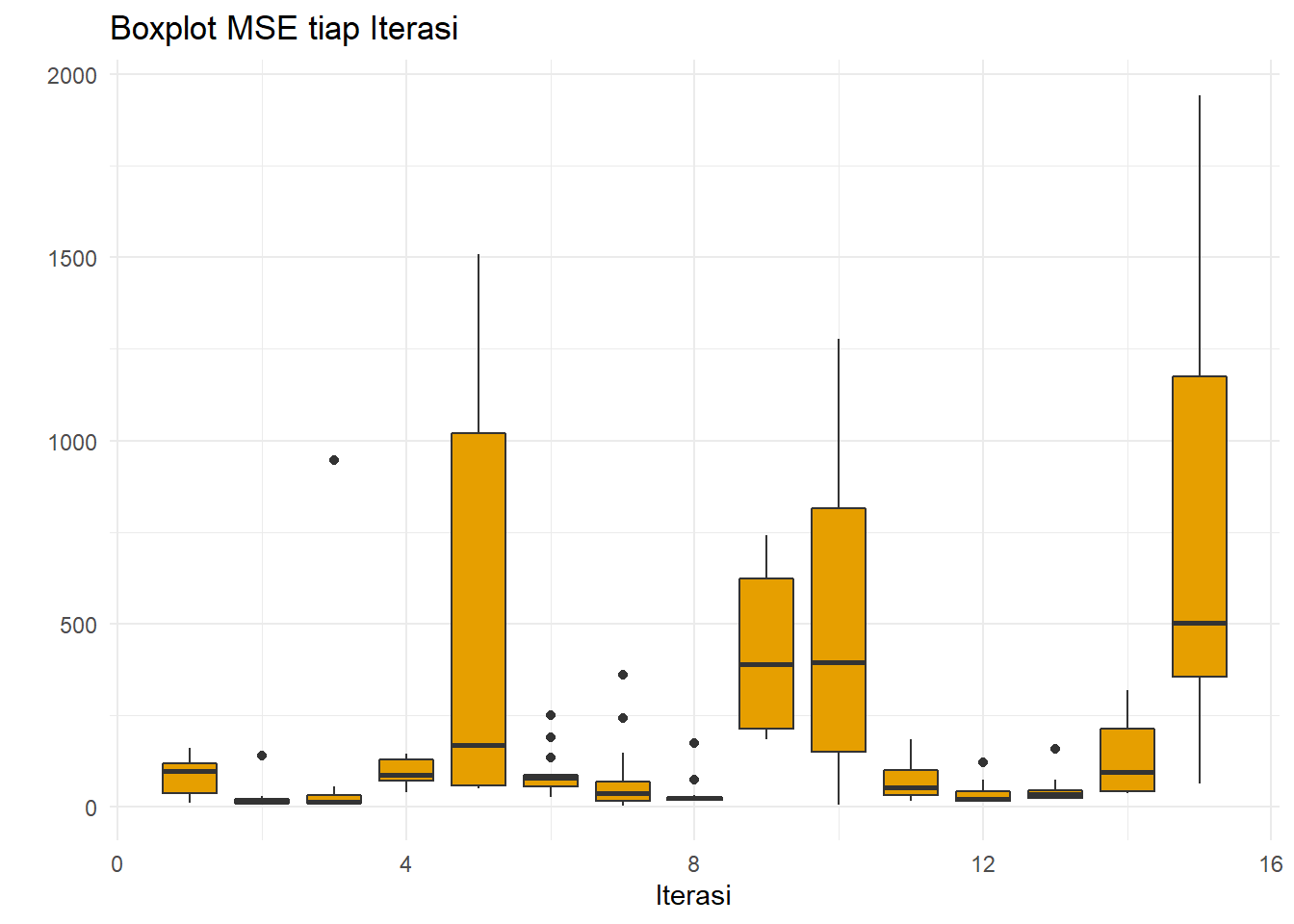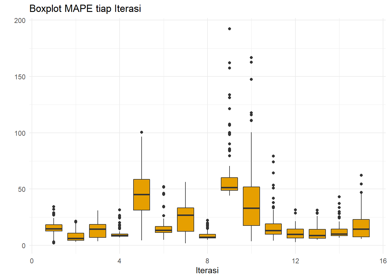 Boxplot untuk iterasi ke-15 ternyata tidak memiliki MAPE besar. Ini terjadi karena MAPE lebih memboboti observasi dengan nilai amatan kecil (COVID saat harga minyak turun) daripada saat nilai amatan besar (Ukraina-Rusia saat terjadi inflasi harga minyak).
