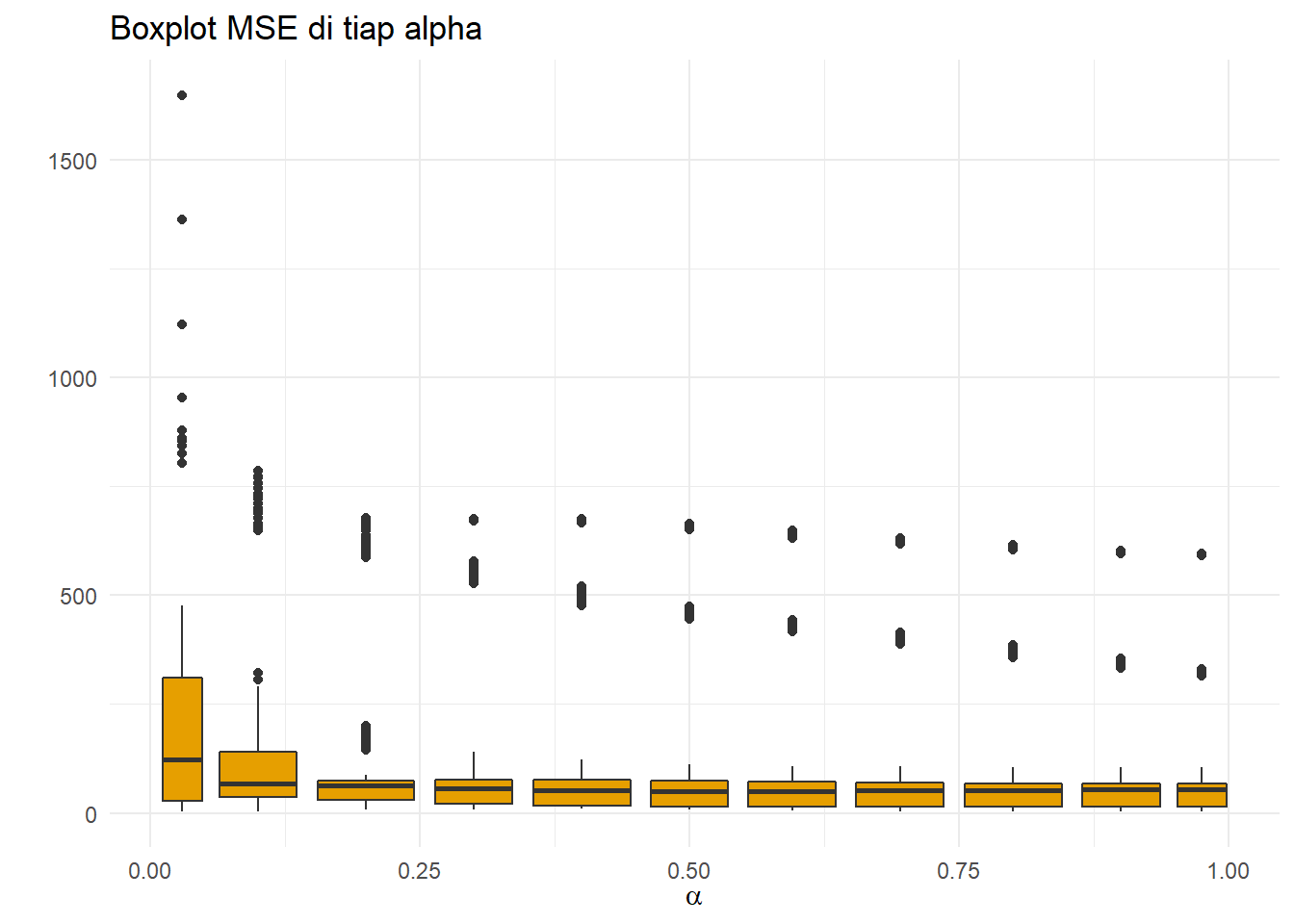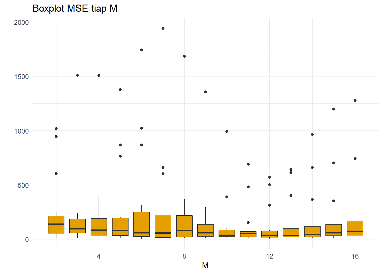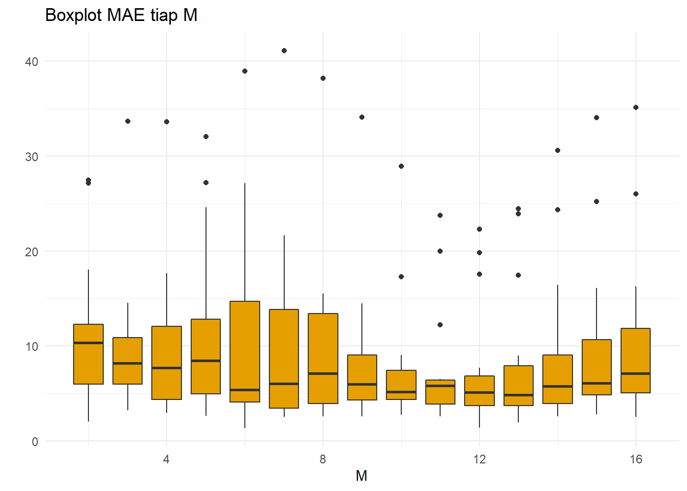 Hasil cukup mirip dengan MSE, tetapi ada sedikit perbedaan. Terlihat bahwa di \(4\leq M \leq 7\), boxplot tidak memiliki pencilan sama sekali. Justru, daerah yang sebelumnya dianggap baik, \(9 \leq M \leq 12\) memiliki beberapa pencilan walaupun boxplot di daerah tersebut menunjukkan keragaman lebih kecil di antara kuantil pertama sampai ketiga.