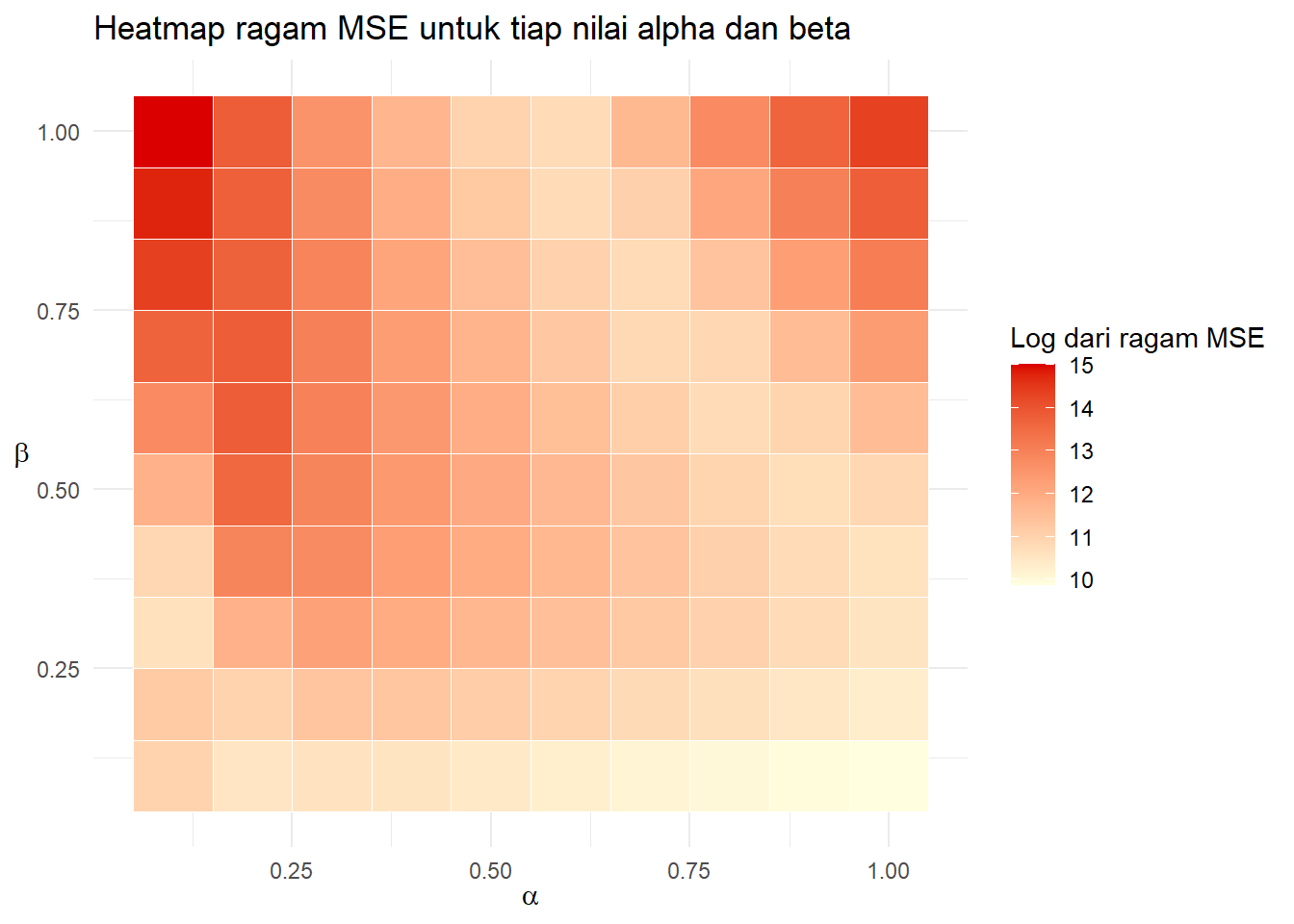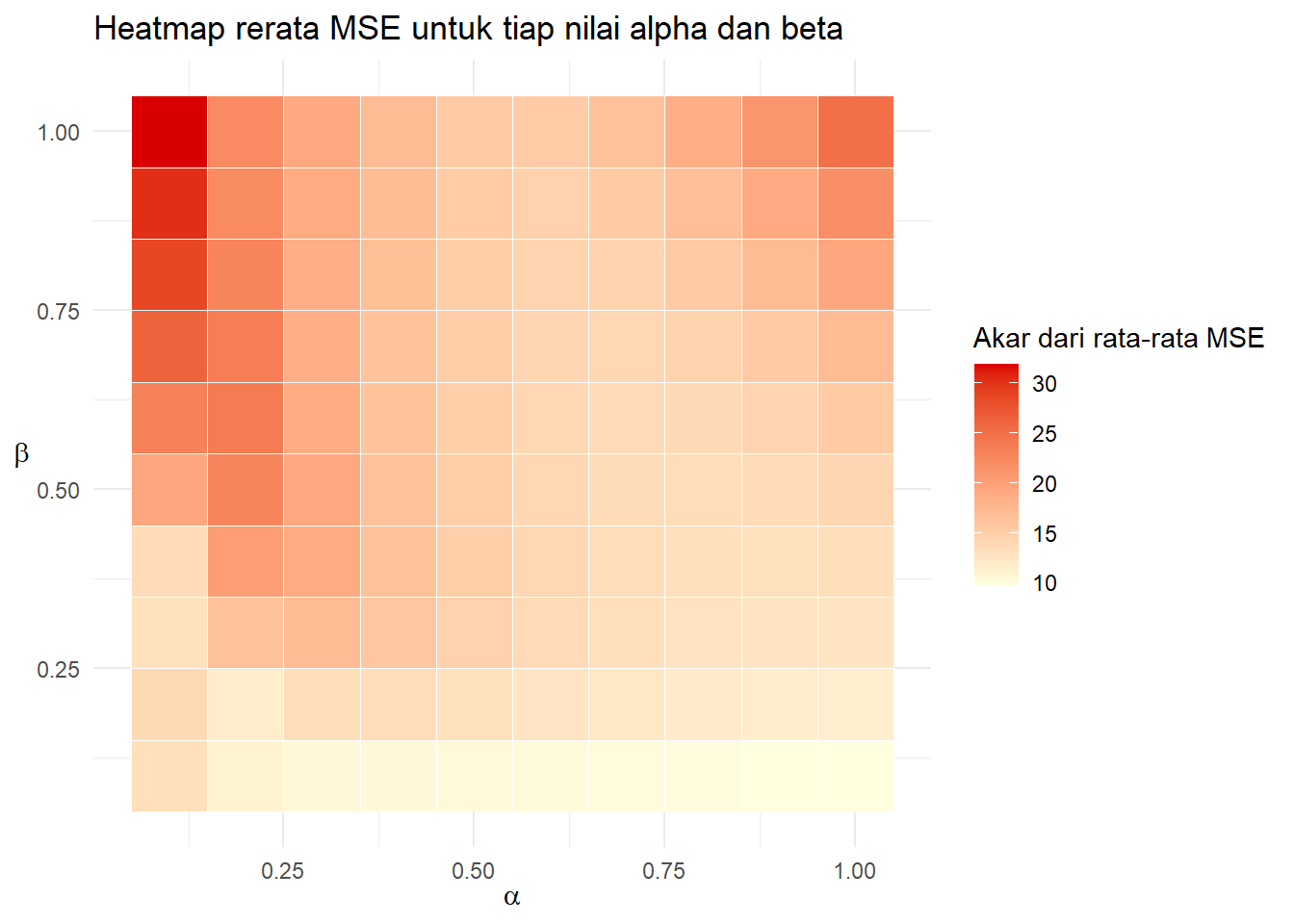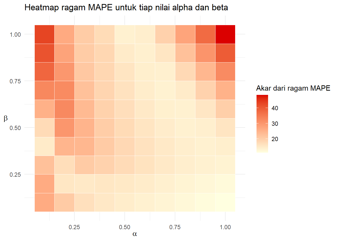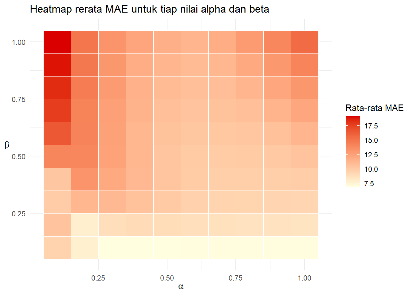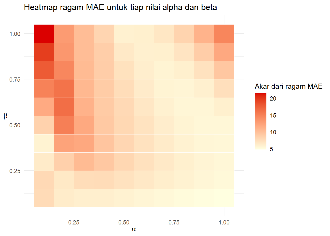 varMAE=var(MAE)), by=list(alphrange,betarange)]Nilai nilai apa saja yang menimumkan MSE, MAPE, dan MAE: