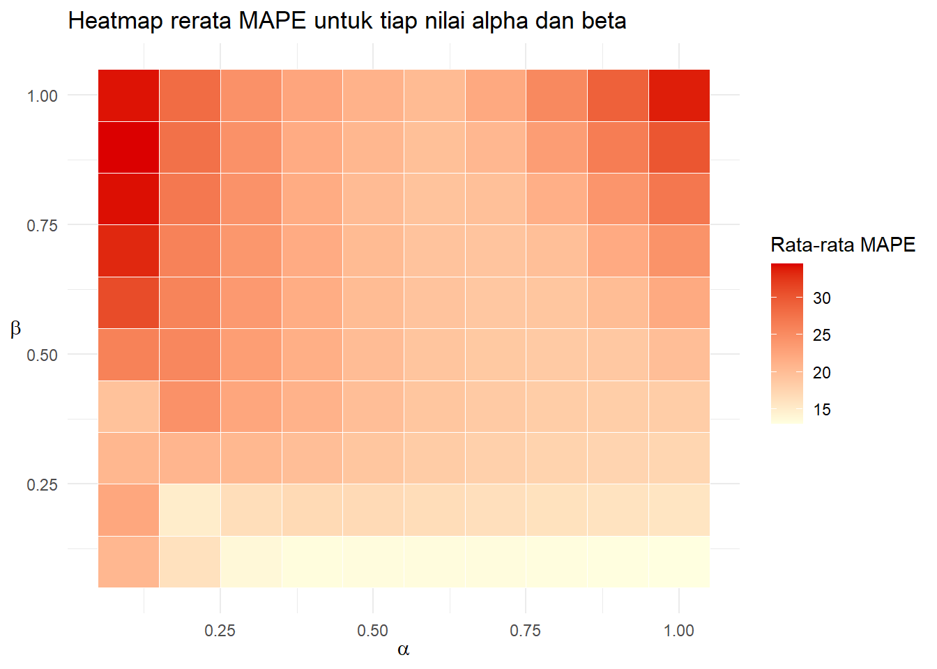 "MAPE"=last(MAPE)),by=list(alphrange,betarange)]Lalu, cari saja nilai yang meminimumkan error: