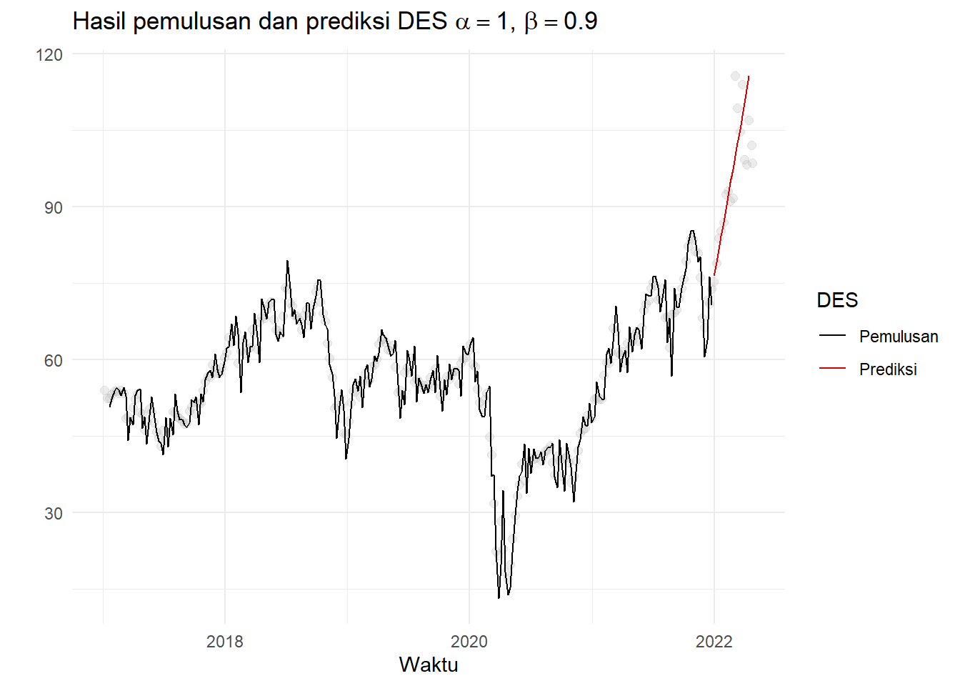 ggtitle(TeX(r'(Hasil pemulusan dan prediksi DES $\alpha=1$, $\beta=0.9$)'))+