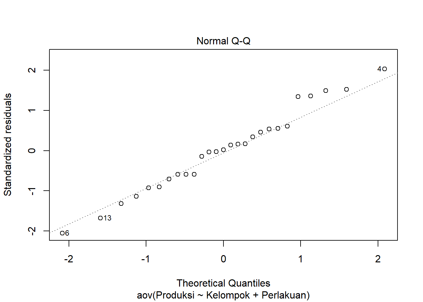 Dari keluaran uji Shapiro-Wilk dapat dilihat nilai p-value = 0.8832 \(> \alpha = 0.05\) maka tak tolak \(H_{0}\), artinya tidak cukup bukti untuk mengatakan bahwa galat tidak menyebar normal sehingga asumsi galat percobaan menyebar normal terpenuhi.