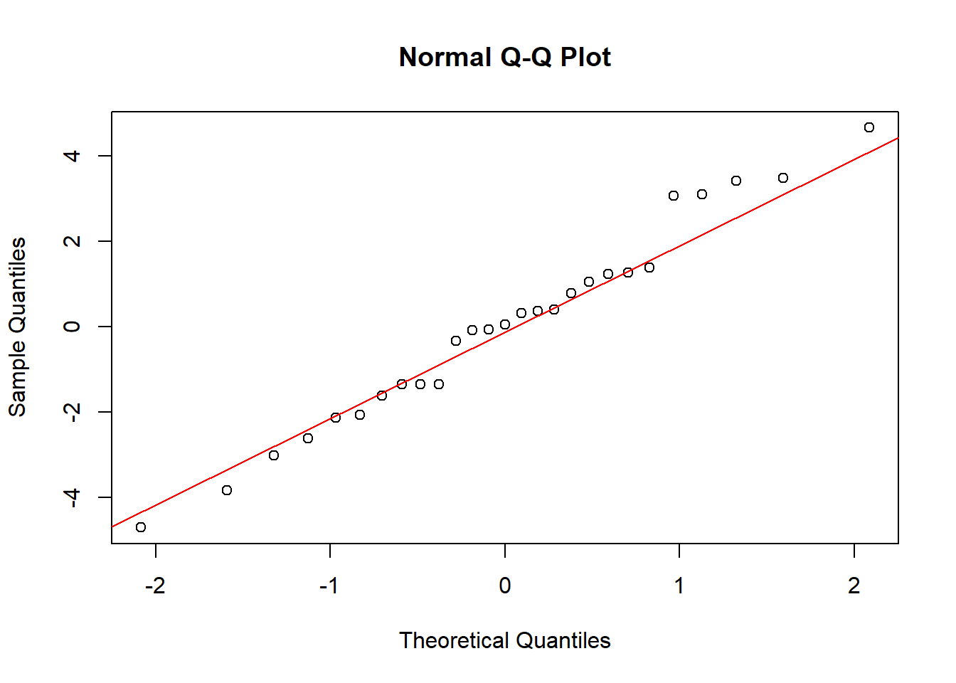 qqnorm(aovRAKL$residuals); qqline(aovRAKL$residuals, col = 'red')