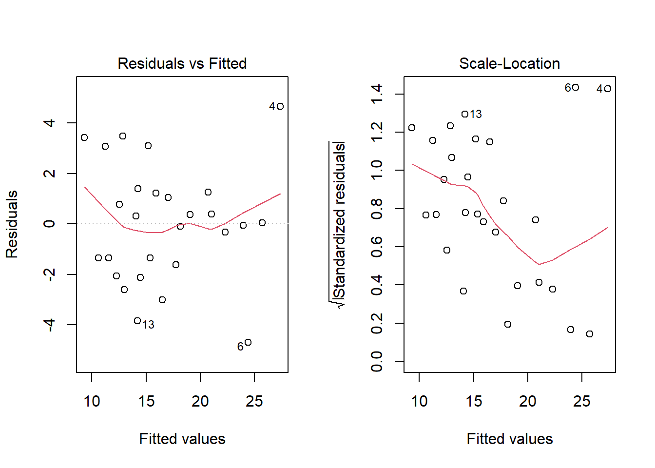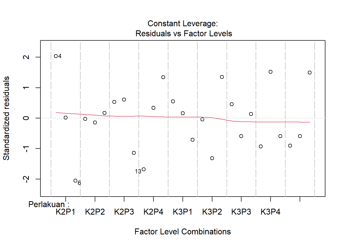 Dari keluaran diatas dapat dilihat nilai p-value = 0.964 (R) > alpha = 0.05 maka Tak Tolak \(H_{0}\), artinya tidak cukup bukti untuk mengatakan bahwa galat tidak menyebar normal sehingga dengan uji Kolmogorov-Smirnov asumsi galat percobaan menyebar normal juga terpenuhi.