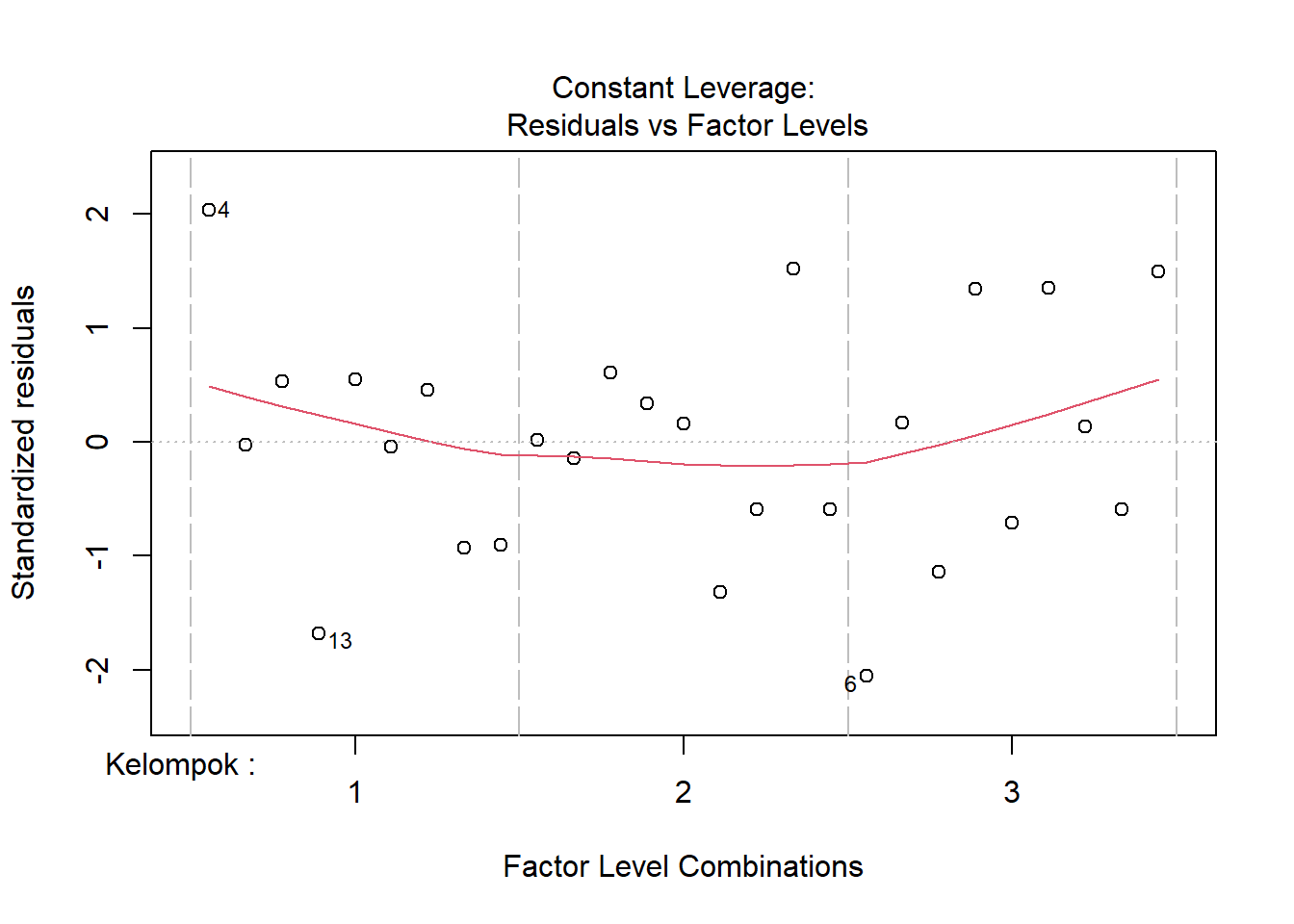 Rancangan-rancangan seperti RAKL dan RBSL mengasumsikan bahwa pengaruh perlakuan dan kelompok aditif - pengaruh tersebut tetap sama di semua kombinasi perlakuan dan kelompok. Sifat tersebut terlihat dari model linear untuk RAKL: \[ y_{ij}=\mu+\tau_{i}+\beta_{j}+\varepsilon_{ij} \] Terlihat bahwa tidak ada interaksi \((\tau_{i}\beta_{j})\) antara perlakuan dan kelompok. Dalam kata lain, efek suatu kelompok dianggap sama di semua perlakuan. Jika asumsi tersebut tidak terpenuhi, dapat terlihat bahwa: \[ v_{ij}=\lambda_{ij}+\varepsilon_{ij}=y_{ij}-\mu-\tau_{i}-\beta_{j} \] Akan menjadi komponen galat. Ini berarti galat akan heterogen tergantung besaran interaksi di kelompok dan perlakuan tertentu, sehingga ragam galat tidak terduga dengan benar. Oleh karena uji-F menggunakan penduga ragam galat, hasil-hasil uji dapat misleading. Ada beberapa cari menguji asumsi ini.