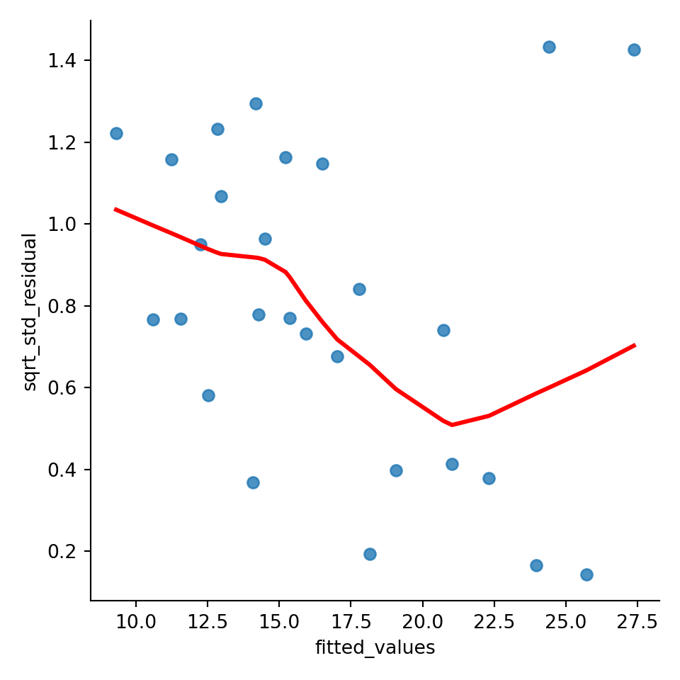 Dari plot di atas dapat terlihat bahwa semua titik cenderung berada kira-kira di sekitar sepanjang garis diagonal tetapi ada satu titik tidak dekat dengan garis dan histogram membentuk seperti kurva sebaran normal sehingga asumsi galat percobaan menyebar normal terpenuhi. Metode qq-plot dan histogram residual di python sebagai berikut. Pertama, lakukan ANOVA: