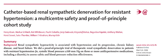 \(^*\)*Esler MD, Krum H, Sobotka PA, Schlaich MP, Schmieder RE, Bohm M. Renal sympathetic denervation in patients with treatment-resistant hypertension (The Symplicity HTN-2 Trial): a randomised controlled trial. Lancet 2010;376(9756):1903-1909