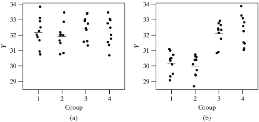 - Graph (b) illustrates a setting where \(H_0\) is false. The means for groups 1 and 2 are quite different from those for groups 3 and 4. The small standard deviation in each group makes it possible to visualize the differences easily