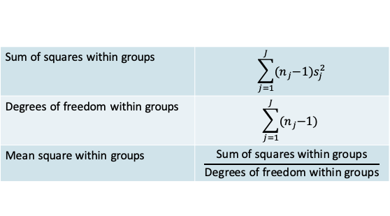 \[s_p^2=\frac{\sum_{j=1}^J(n_j-1)s_j^2}{\sum_{j=1}^J(n_j-1)}\]