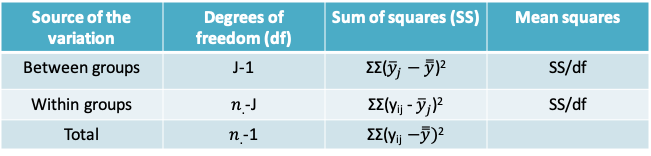 - The following slide depicts the ANOVA table that is used to summarize the information on the total, the between-group and the within-group variation