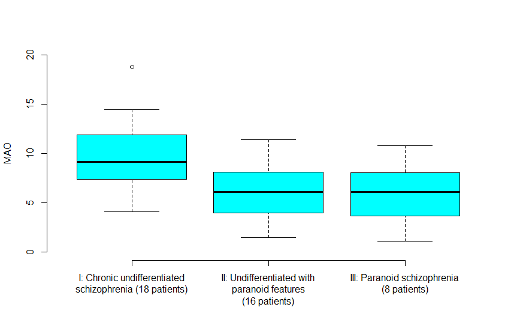 | III: Paranoid schizophrenia (8 patients) | 6.4 10.8 1.1 2.9 4.5 5.8 9.4 6.8 | 6.0 | 3.2 |