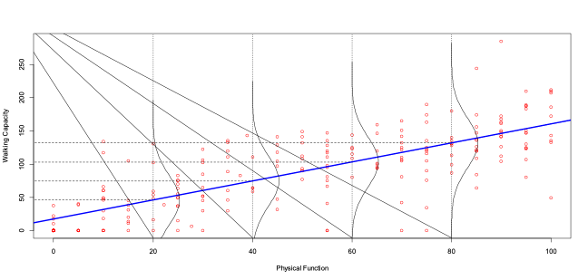 - The sample correlation is approximately 0.78, implying there is a positive, linear relationship between physical function and walking capacity