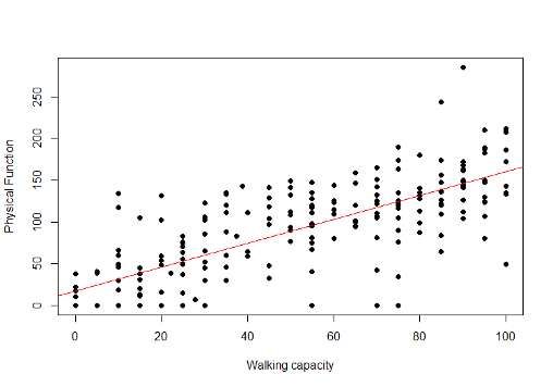 Draw a rough scatter plot to visually examine the relation between Walking Capacity and Physical Function
