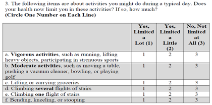 - Physical Function (X): Physical Function Index of SF-36. Self-report questionnaire that asks limitations on certain activities (walking a block, climbing stairs etc.)