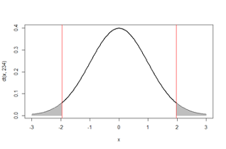 - The two areas each covering with 0.025 probability in the extremes are unlikely under the null hypothesis as illustrated by the diagram. They correspond to a Type I error of 0.025+0.025 = 0.05, which we will define shortly