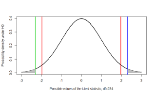 - Under the t-distribution with degrees of freedom = n-1 = 234, these areas may be identified by the quantiles \(Q_{0.025} = -1.97\) and \(Q_{0.975} = 1.97\)