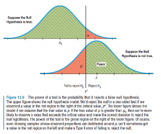 - Type II error (β): We fail to reject \(H_0\) when it is not true (i.e. when \(H_A\) is true)