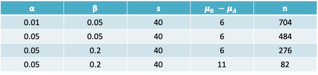 - If we write the standard error of an estimated difference in mean responses as \(\sigma\sqrt{\frac{1}{n_1}+\frac{1}{n_2}}\) where \(\sigma\) is the standard deviation and n1 and n2 are the sample size in each group, then we can establish the following principles (which would apply to both means and proportions: