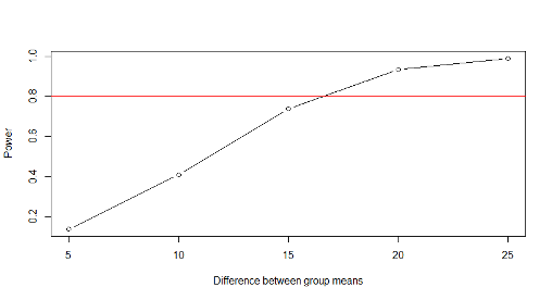 which is slightly lower than the result based on the approximation using the normal quantile * To find the power for a series of different values for the minimum difference we can use the following R code (in red)