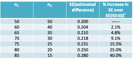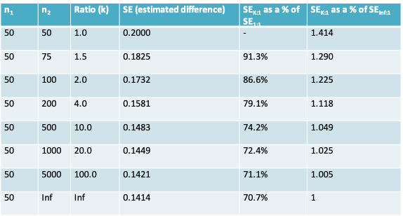 - If one type of unit is much scarcer, and thus the limiting factor, then it makes sense to choose all (say \(n_1\)) of the available scarcer units, and some \(n_2 \geq n_1\) of the other type. The greater is \(n_2\), the smaller the standard error of the estimated difference.
