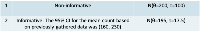 - a subjective prior based on previously observed data: e.g. the 95% confidence interval of the mean count from earlier pilot study