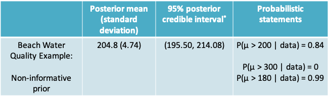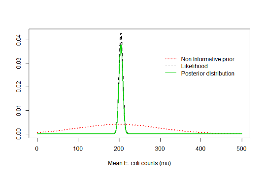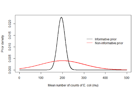 - a subjective prior belief: e.g. “it is highly unlikely that the true mean is greater than 400 counts/100mL”