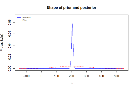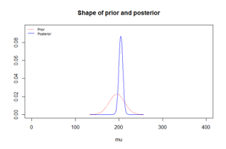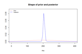 - Notice that the non-informative prior has a very high standard deviation. This was chosen so that our normal prior distribution translates into an approximately uniform distribution over the range from 150 to 250
