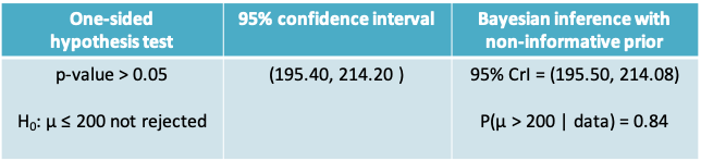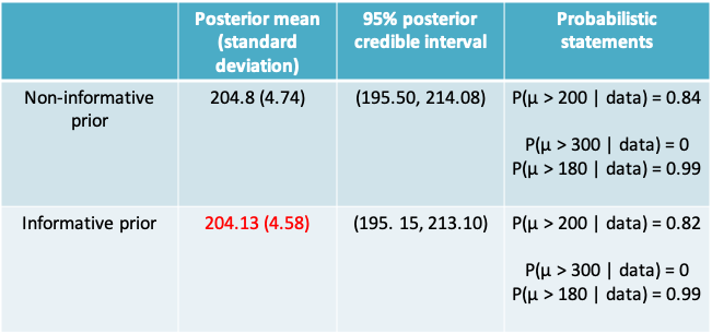 - Inferential statements of the form P(Hypothesis about µ | data), e.g. P(µ > 200 | Observed mean = 204.8 )