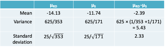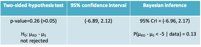 \(\mu_{RD}-\mu_s|data\) ~ N(mean=-2.39, standard deviation=2.33)