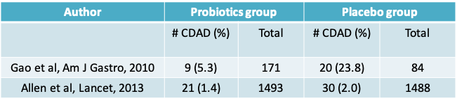 - Therefore, the Gao study leads to the interpretation that roughly 4 patients need to be given probiotics to prevent 1 case of CDAD