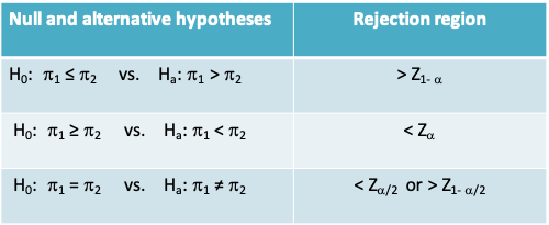 - In the expression for the hypothesis test, replace \(Z_{1-α/2}\) by \(Z_{1-α}\) for a one-sided test