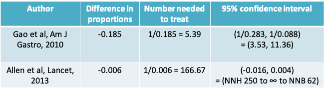 - When the risk difference is not statistically significant the interval encompasses both the NNH (or number needed to harm) and the NNB (number needed to benefit) and is more complicated. One way to write the interval is as (\(1/d_H\) to ∞ to \(1/d_L\)), e.g. see the paper by Altman (BMJ 1998) on course website