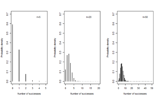 - This expression can get very cumbersome to evaluate (especially with no computer) as n increases. Also tables of the Binomial distribution will not list all values of n