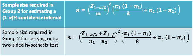 | Desired precision (or half-width of interval or margin or error) (m) | The minimum important difference to detect \((π_1 - π_2 = m)\) |