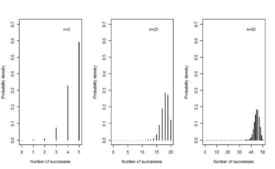 - Let us look at the sampling distribution when n=5, 20 and 50 and π=0.1, 0.5 and 0.9