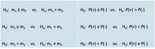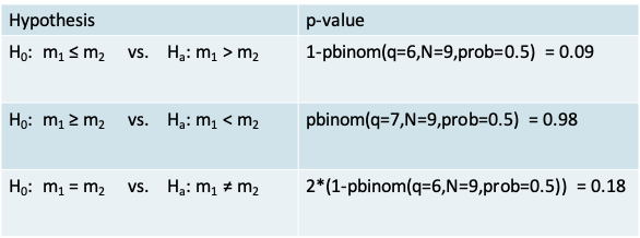 - Null and alternative hypotheses can be expressed either in terms of the median or in terms of the number of positive signs: