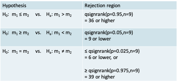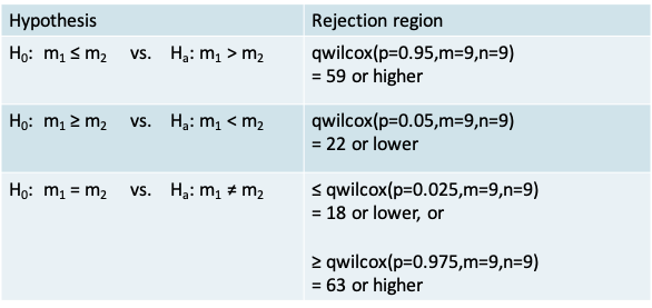 - We can use the R function qwilcox() to obtain the quantiles that defined the rejection region for our example. Note that m is the number of controls and n is the number in the treatment group.