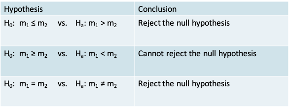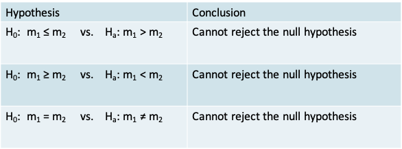 - The conclusion when using each of the three alternative hypotheses in the context of our example appears in the table below