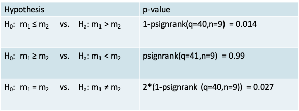 - The p-value corresponding to each alternative hypothesis appears in the table below. It is calculated using the psignrank() function for the cumulative probability under the Wilcoxon signed rank distribution.