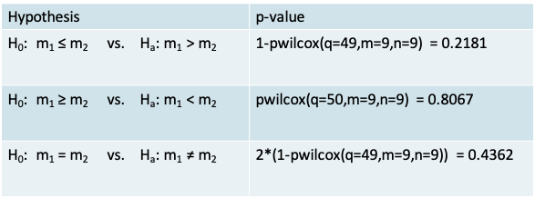 - The p-value corresponding to each alternative hypothesis appears in the table below. It is calculated using the pwilcox() function for the cumulative probability under the Wilcoxon rank sum distribution