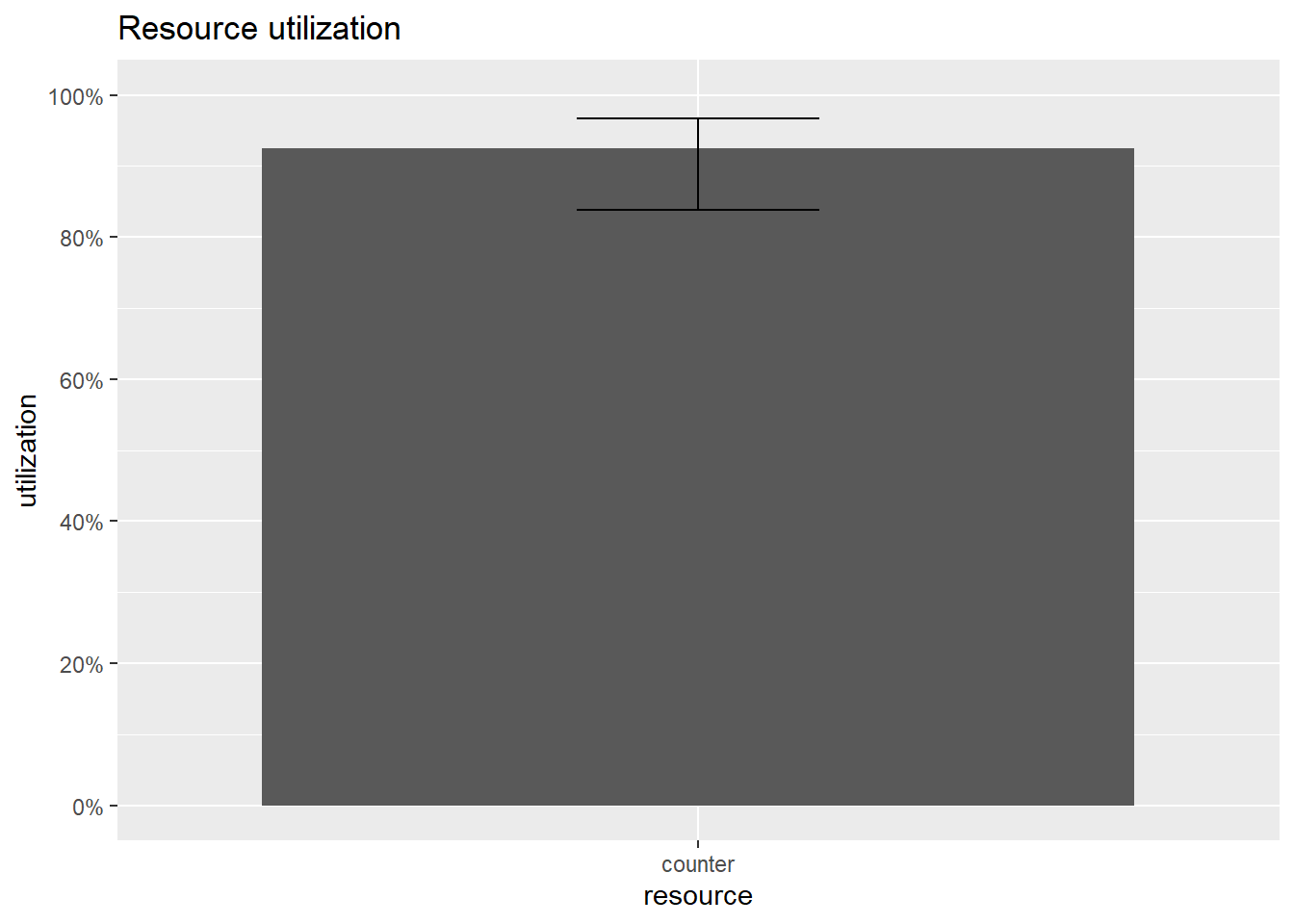 Compared to previous plots we now notice that the output also has something that resembles a boxplot which tells us what was the utilization of the resource in different simulation runs.