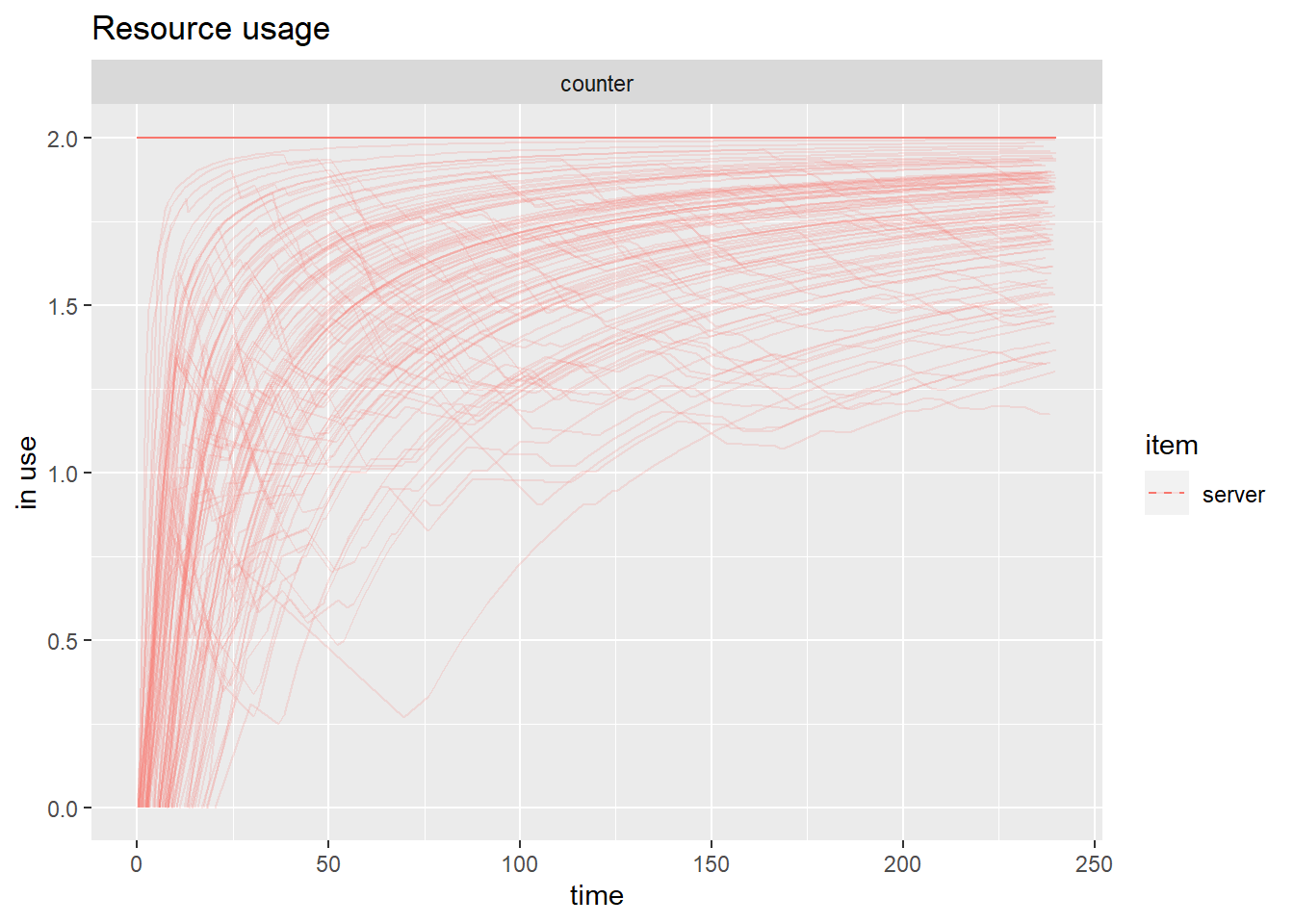 We can also assess how busy were the employees in different simulations. As the shop opens the two employees become more and more busy and at the end of the four hours they are busy almost all the time.