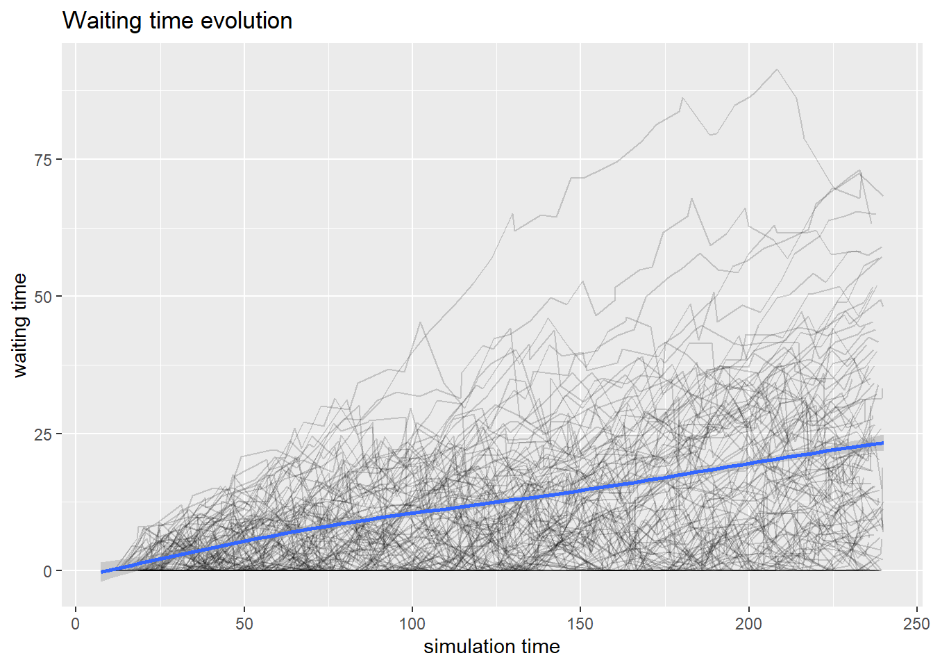 Each black line represents a single simulation and the blue line gives an overall representation of the simulation. We can see that the waiting time seems to be linearly increasing with time.
