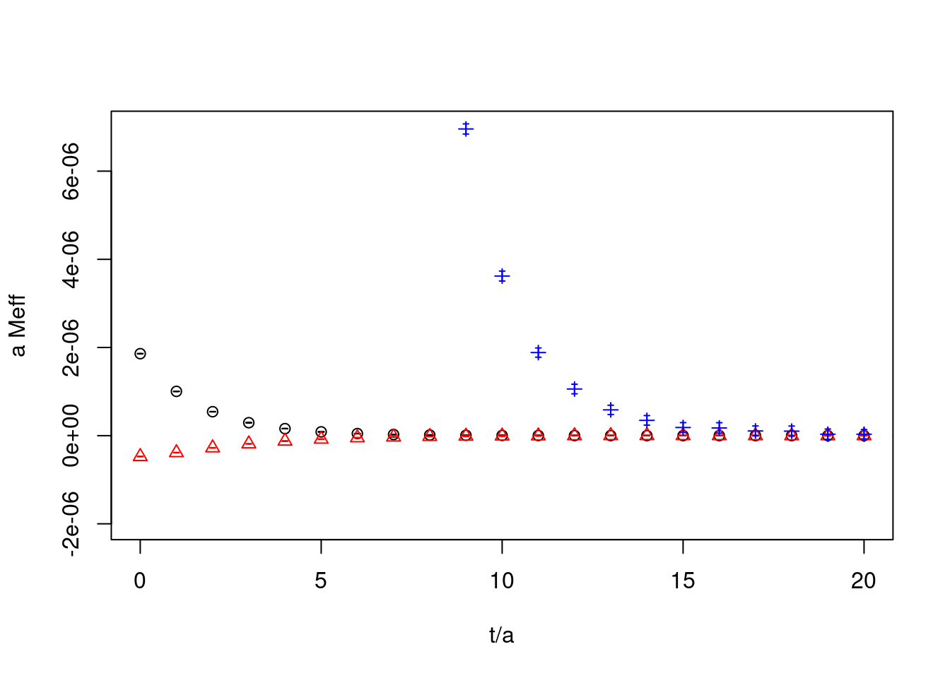 plot(cor1, ylab="a Meff", xlab="t/a", col="black", xlim=c(0,20),ylim=c(-2e-6,7e-6))