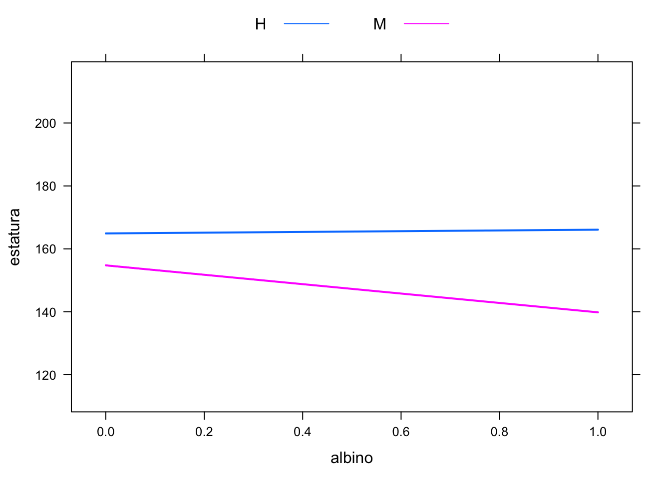 summary(aov(estatura ~ sexo*albino , data=estaturas))## Df Sum Sq Mean Sq F value Pr(>F)