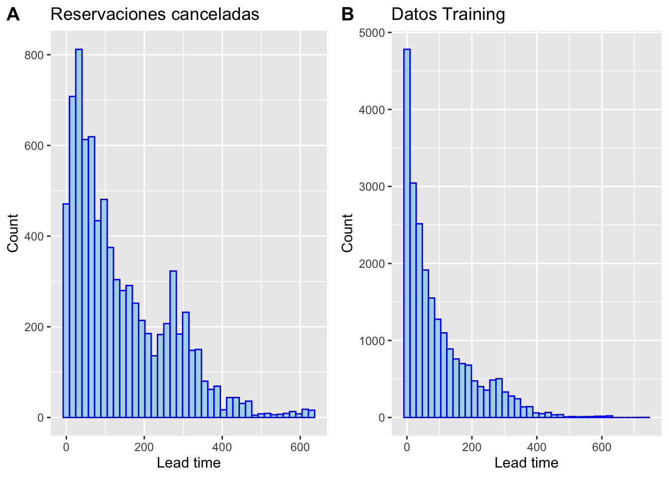 Si observamos la variable Lead_time antes de la extracción de los datos de cancelación vemos solamente que existe un sesgo, sin embargo, al graficar la misma variable seleccionando solo donde se hicieron cancelaciones podemos ver más claramente la distribución y los picos que son interesantes para nuestro análisis