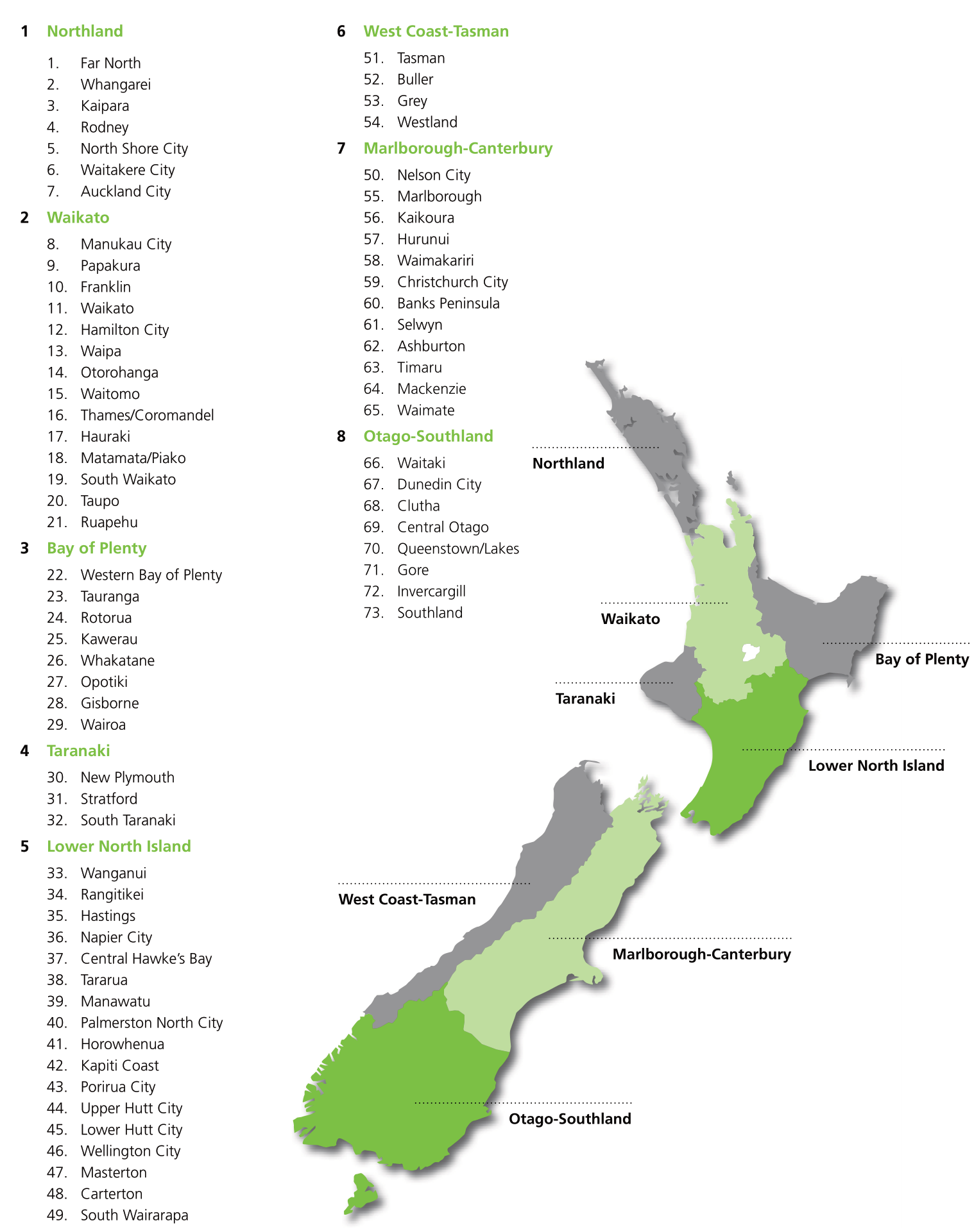 This survey uses geographic regions and districts as defined by the 73 Territorial Local Authorities. These districts are amalgamated into eight regions, five in the North Island and three in the South Island.
